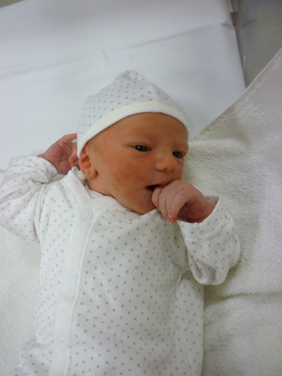 Shortly after this picture was taken, Tim dressed Nicholas … almost forgetting to put a nappy on. Nicholas had to wear the clothes for a tiny baby, so put on an outfit covered with stars.