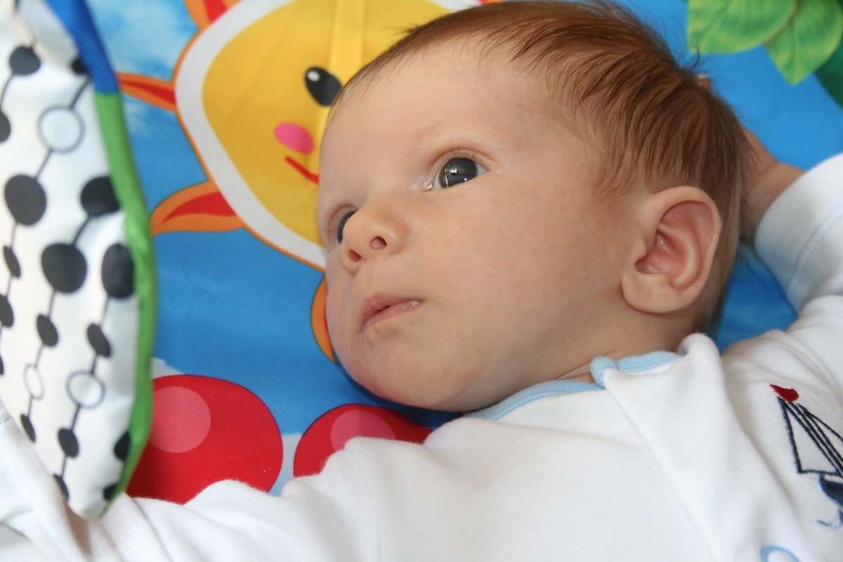 Nicholas really enjoys playing on his playmat, with some tummy time and also lying on his back watching the toys hanging from above.